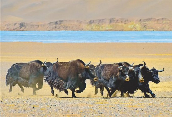 野牦牛在西藏自治區(qū)改則縣亞熱鄉(xiāng)的草原上飛奔。