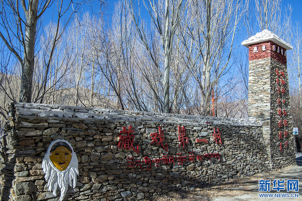 圖為扎西曲登社區(qū)大門旁的雅礱扎西雪巴藏戲面具和標(biāo)語(yǔ)(12月9日攝)。新華網(wǎng) 旦增努布 攝