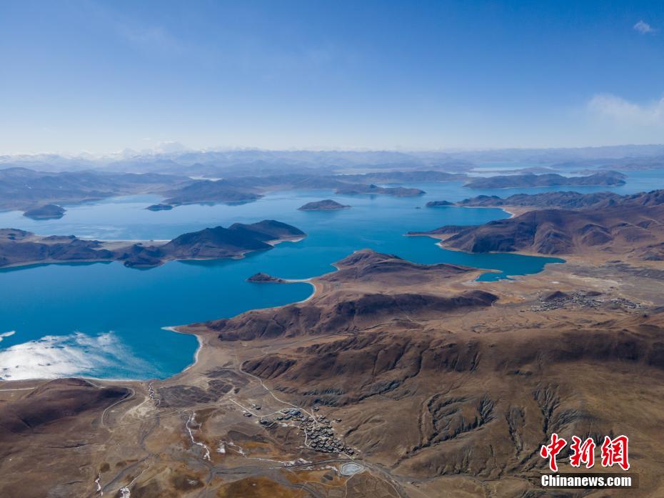 近日,西藏自治區(qū)山南市羊卓雍錯(簡稱羊湖),冬日由于沒有云層遮擋,湖水更顯深藍、孔雀藍。航拍視角下,湖水像巨大的寶石鑲嵌于高原大地,風(fēng)光壯麗。羊卓雍錯藏語意為“碧玉湖”,湖面海拔4441米,與納木錯、瑪旁雍錯并稱西藏三大“圣湖”。圖為航拍冬日羊卓雍錯。 江飛波 攝