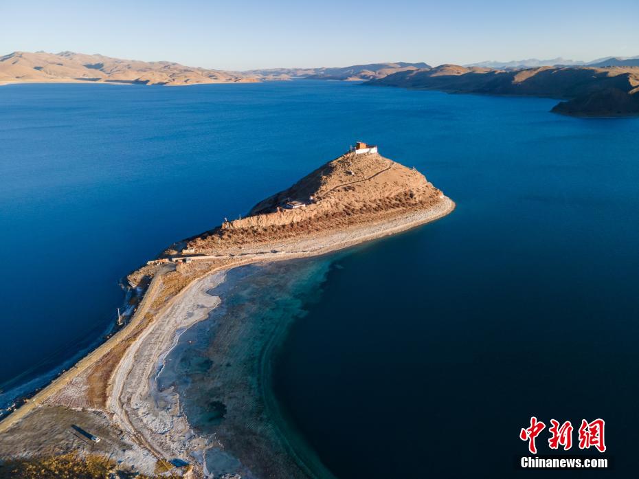 近日,西藏自治區(qū)山南市羊卓雍錯(簡稱羊湖),冬日由于沒有云層遮擋,湖水更顯深藍、孔雀藍。航拍視角下,湖水像巨大的寶石鑲嵌于高原大地,風(fēng)光壯麗。羊卓雍錯藏語意為“碧玉湖”,湖面海拔4441米,與納木錯、瑪旁雍錯并稱西藏三大“圣湖”。圖為羊湖著名景點日托寺。 江飛波 攝
