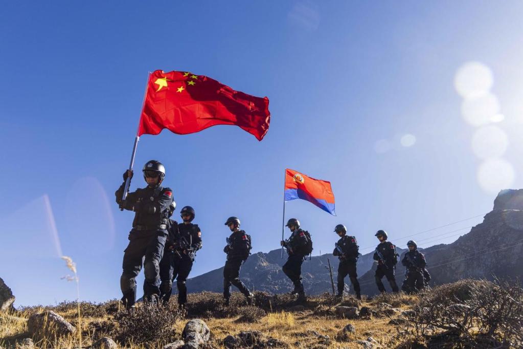 1月6日,西藏亞東出入境邊防檢查站移民警察在海拔4300余米的西藏亞東縣乃堆拉山口,對國門邊境沿線山口要道、河谷、溝口等區(qū)域開展巡邏踏查,守衛(wèi)國門邊境,向第三個“中國人民警察節(jié)”(1月10日)獻禮。