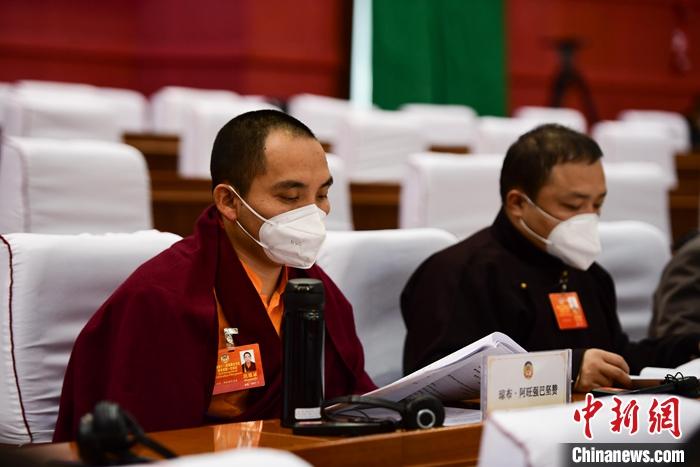 1月12日,政協(xié)第十二屆西藏自治區(qū)委員會(huì)第一次會(huì)議在拉薩開幕,西藏政協(xié)宗教界委員瓊布·阿旺強(qiáng)巴堅(jiān)贊活佛(左)出席開幕會(huì)。 中新社記者 貢嘎來(lái)松 攝