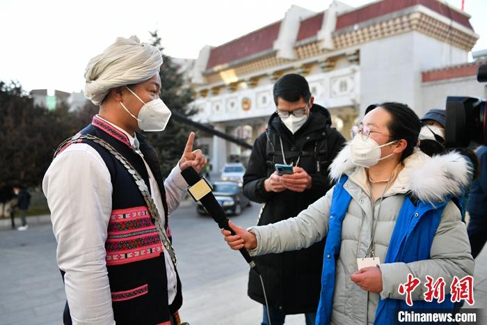 1月12日,政協(xié)第十二屆西藏自治區(qū)委員會(huì)第一次會(huì)議在拉薩開幕,西藏政協(xié)文化藝術(shù)節(jié)界委員迪龍(左)接受媒體的采訪。 中新社記者 貢嘎來(lái)松 攝