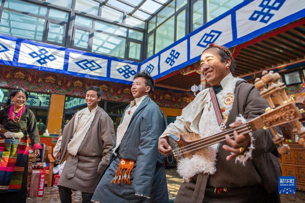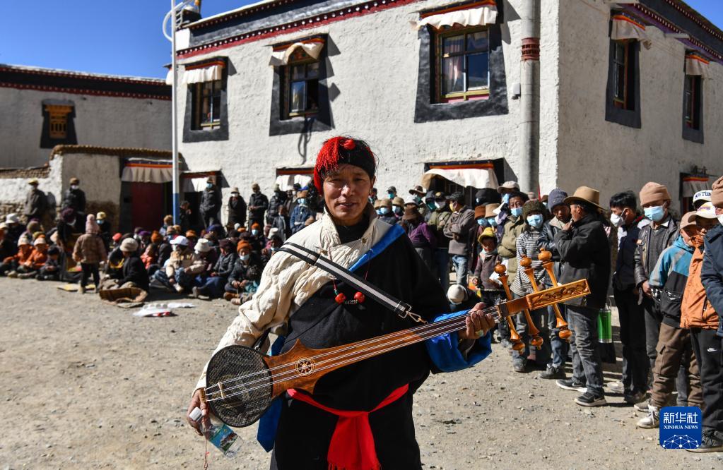 在西藏日喀則市芒普鄉(xiāng)普村的“村晚”現(xiàn)場(chǎng),演員手持扎念琴準(zhǔn)備表演傳統(tǒng)節(jié)目(1月21日攝)。新華社記者 晉美多吉 攝