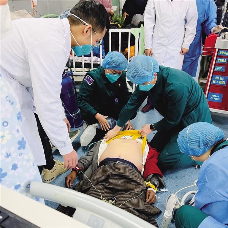急診科值班醫(yī)生陳勝、副護(hù)士長趙文熠等立即攜搶救車、除顫儀趕赴現(xiàn)場,此時(shí),冬某意識喪失、頸動(dòng)脈搏動(dòng)消失、呼吸極其微弱。見患者病情危及生命,醫(yī)護(hù)人員立即實(shí)施搶救工作。急診醫(yī)護(hù)團(tuán)隊(duì)配合默契,胸外心臟按壓、球囊輔助通氣、建立靜脈通道、靜推腎上腺素、查心電圖、監(jiān)測生命體征、吸痰……一切有條不紊地進(jìn)行著。隨后,心電圖提示室顫,醫(yī)護(hù)人員立即予以非同步200J電除顫1次,待轉(zhuǎn)運(yùn)床到位后立即轉(zhuǎn)運(yùn)患者至搶救室進(jìn)一步救治,轉(zhuǎn)運(yùn)過程中心肺復(fù)蘇不間斷。