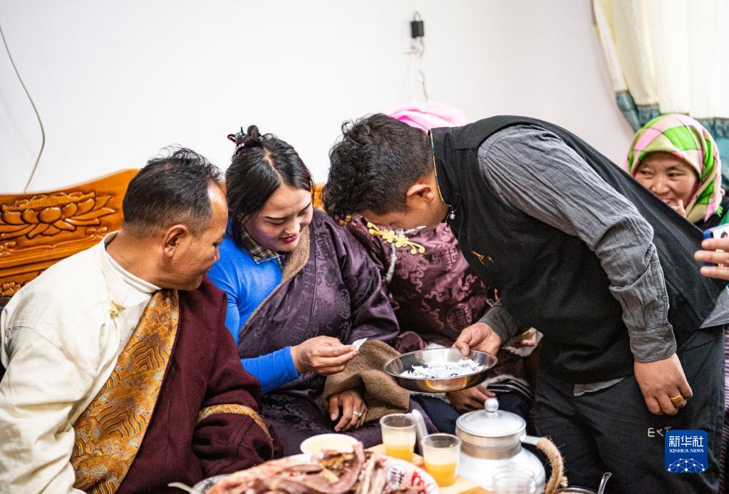 在位于森布日安置點的家中,石秀次仁一家正在吃“古突”(2月19日攝)。