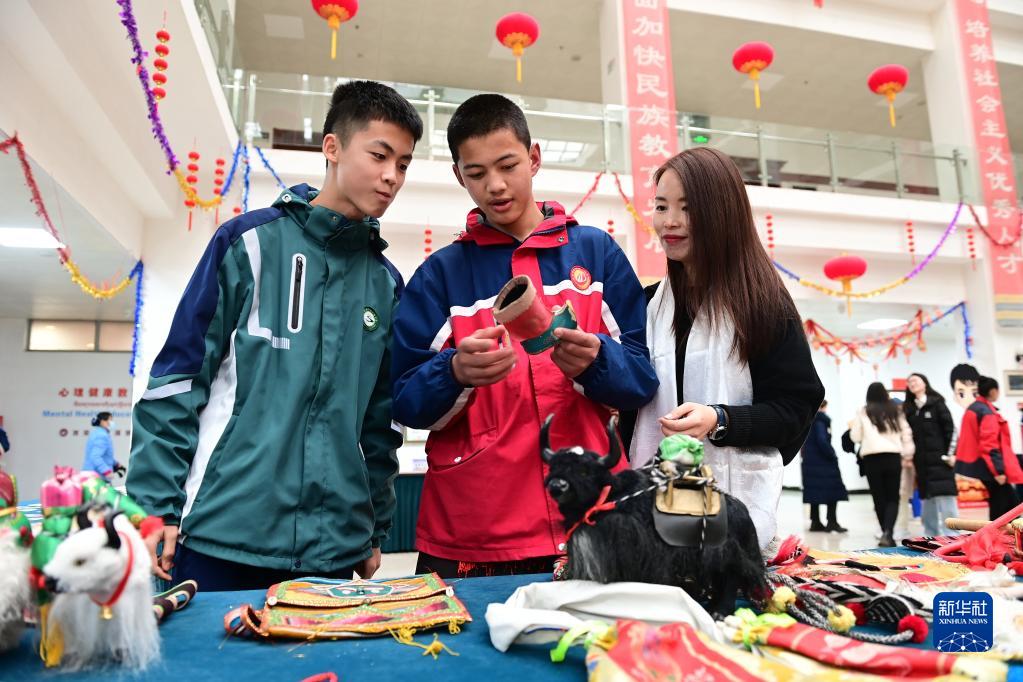2月21日,在西安市浐灞第一中學(xué)舉行的藏歷新年團(tuán)拜活動上,家長和學(xué)生參觀藏族文化展。新華社記者 李一博 攝