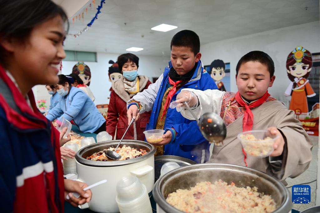2月21日,在西安市浐灞第一中學(xué)舉行的藏歷新年團(tuán)拜活動上,漢藏學(xué)生品嘗特色小吃。新華社記者 李一博 攝