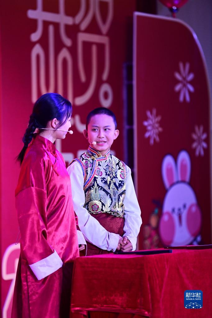 2月21日,在西安市浐灞第一中學(xué)舉行的藏歷新年團(tuán)拜活動上,漢藏學(xué)生一起表演相聲。新華社記者 李一博 攝
