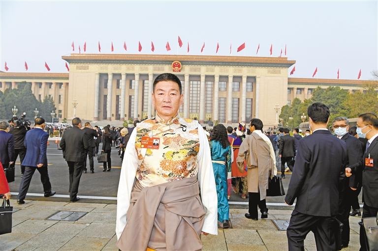圖為全國人大代表扎西尼瑪在人民大會(huì)堂前拍照留念。記者 李洲 攝