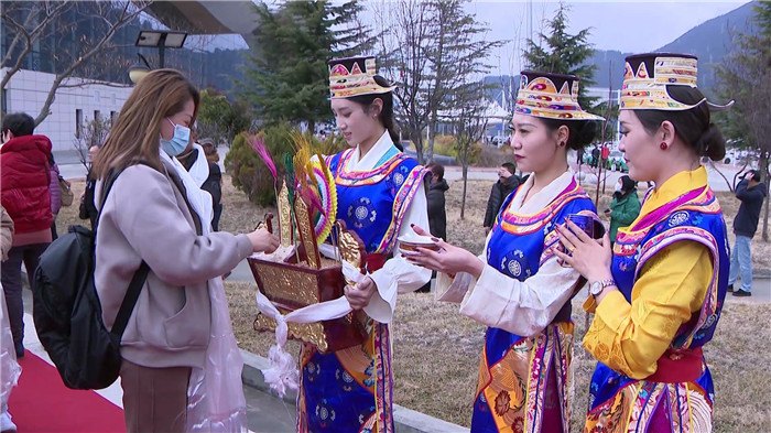在歡迎儀式上,漂亮的工布姑娘唱起了歌,帥氣的工布小伙端起了香醇的青稞酒,副市長段剛輝為游客們獻上潔白的哈達(dá),對遠(yuǎn)道而來的客人表示熱烈的歡迎和誠摯的祝福,并在致辭中向游客們介紹了林芝的自然風(fēng)光和民俗文化。