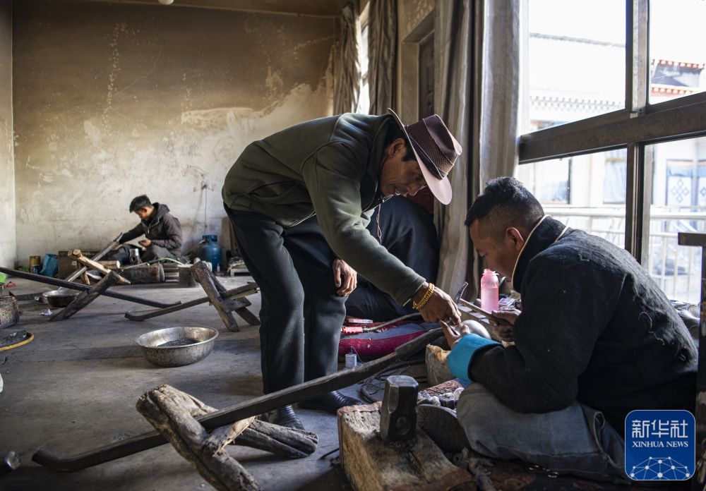 在扎西吉彩金銀銅器廠,廠長拉巴瓊達(dá)(前左)在指導(dǎo)年輕的手工藝人(3月9日攝)。