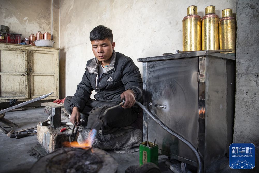 在扎西吉彩金銀銅器廠,一名手工藝人在打制銀器(3月9日攝)。