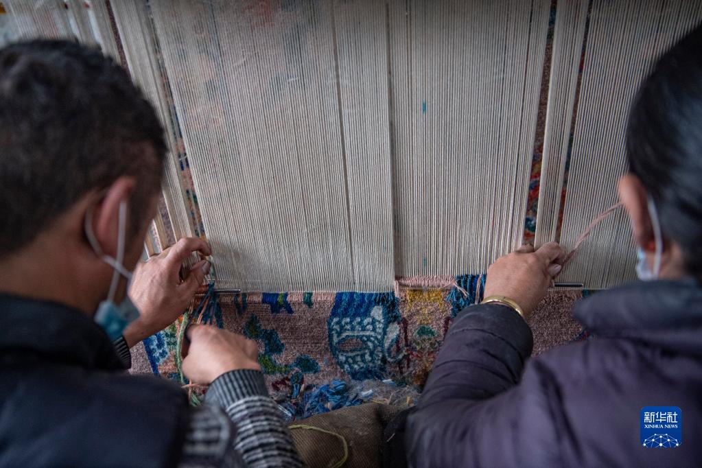 在江孜縣地毯廠,工人們編織卡墊(3月19日攝)。新華社記者 孫非 攝