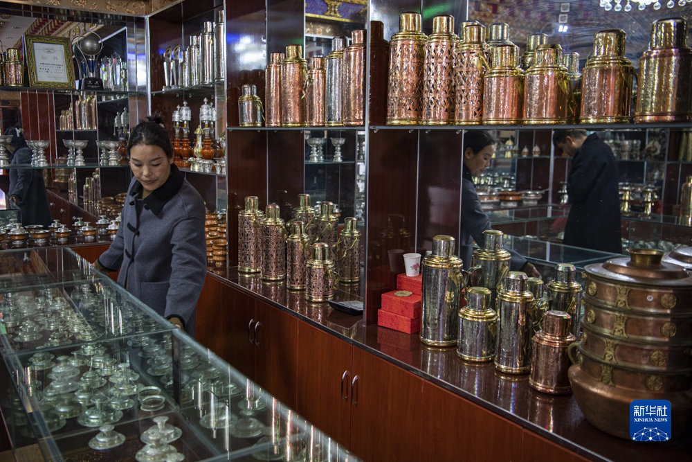 這是扎西吉彩金銀銅器加工廠的產品展示間(3月9日攝)。新華社記者孫非 攝