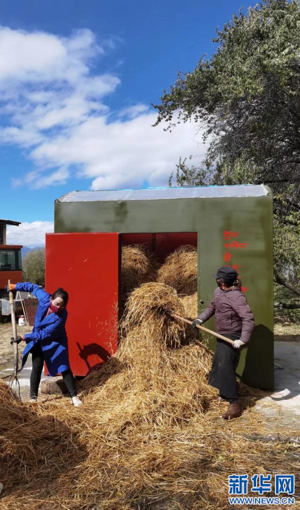 巴宜區(qū)拉丁嘎三村村民正在將秸稈填入有機(jī)垃圾生態(tài)處理箱。