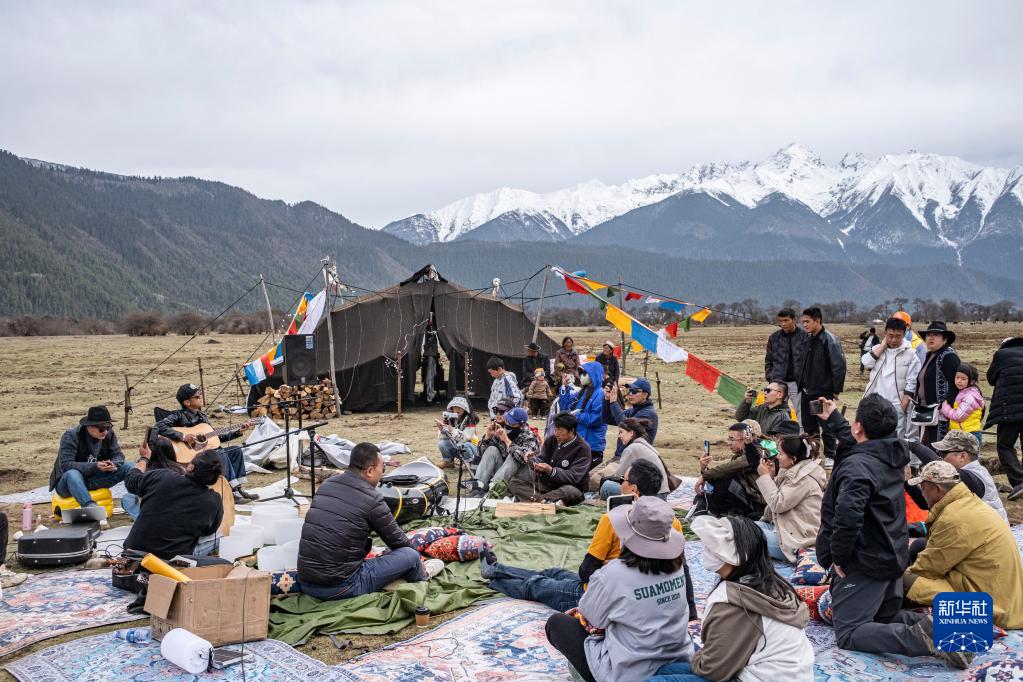 4月15日,在“巴松錯(cuò)漂流露營(yíng)大會(huì)”現(xiàn)場(chǎng),游客在觀看文藝表演。新華社記者 曹檳 攝