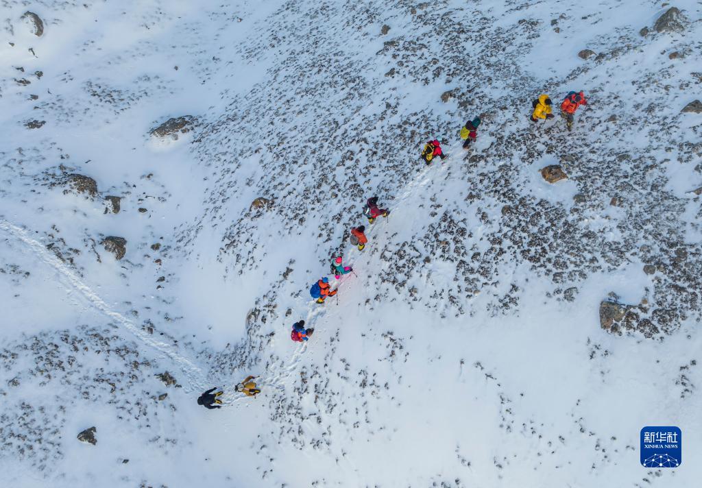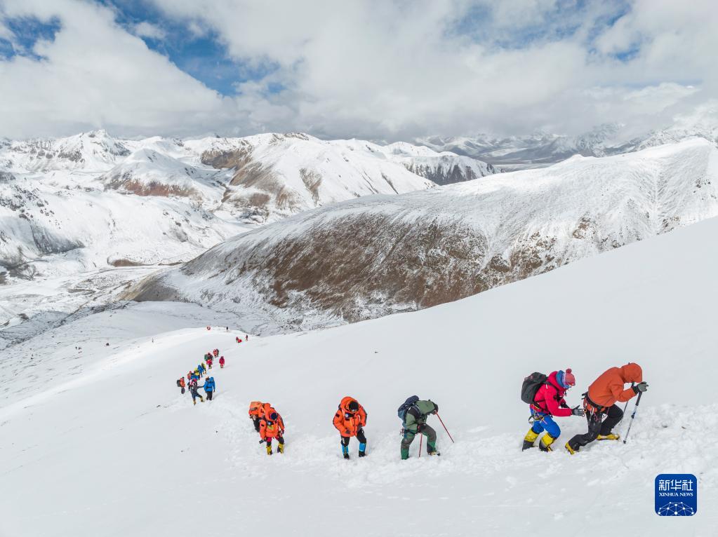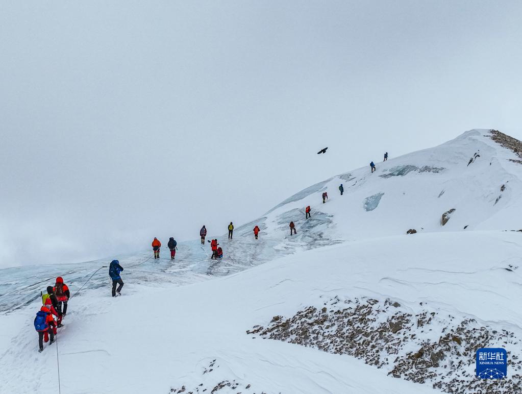 5月3日,登山愛好者正在向海拔6010米的洛堆峰峰頂進(jìn)發(fā)(無(wú)人機(jī)照片)。新華社記者 孫非 攝