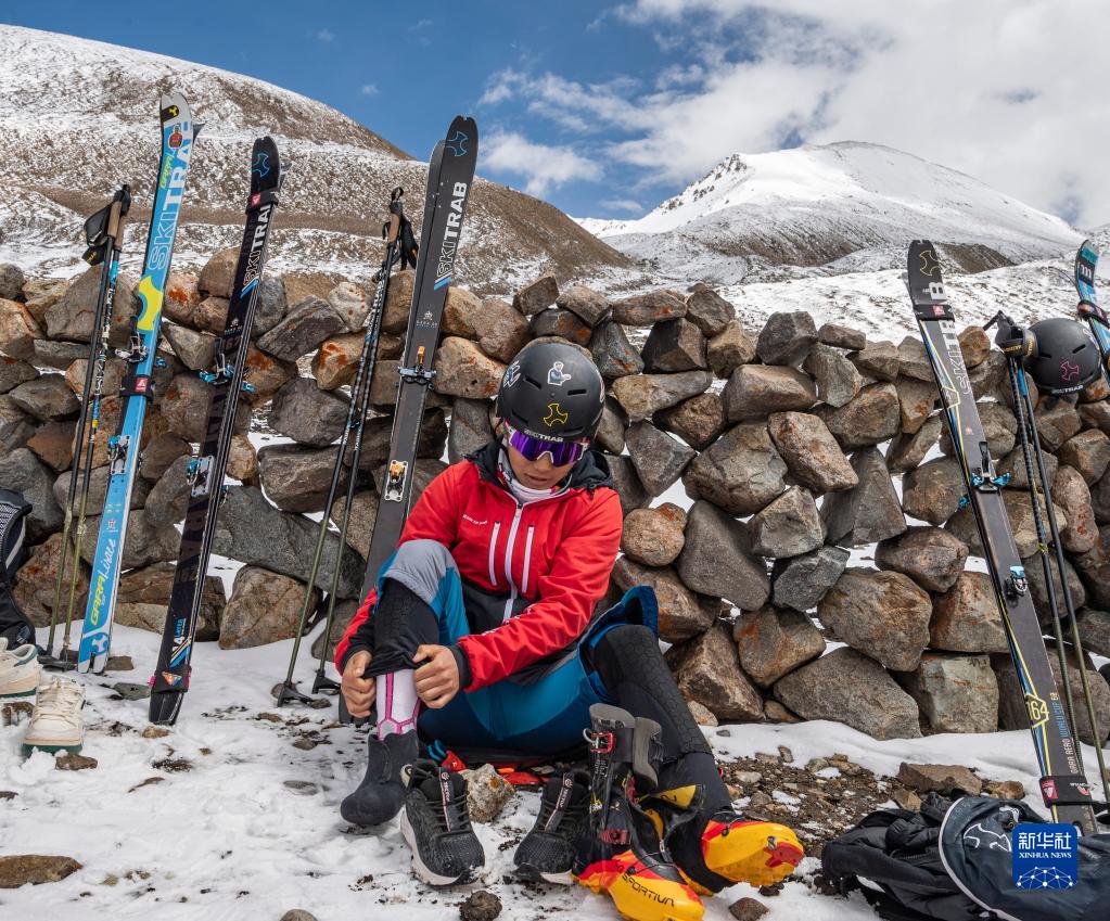在西藏拉薩市當(dāng)雄縣羊八井鎮(zhèn),玉珍拉姆(左二)和隊友進(jìn)行滑雪登山訓(xùn)練(5月2日攝)。新華社記者 孫非 攝