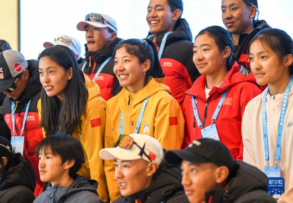 在新疆富蘊(yùn)縣,玉珍拉姆(中排右三)和參與全國首屆滑雪登山冠軍賽的西藏代表隊隊友合影留念(4月7日攝)。新華社記者 胡虎虎 攝