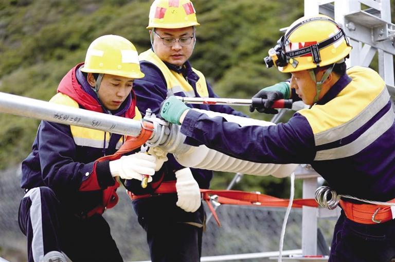 “高空作業(yè),大家把安全帽戴好!”彭江江不時提醒道。王偉點頭示意回應(yīng)工長彭江江,隨后輕車熟路地將安全帶系在斜腕臂上,右手緊緊抓住上方的腕臂,右腳跨上懸空的定位管,左腳一蹬,穩(wěn)穩(wěn)地站在了斜腕臂上。工友蔣瀟和次仁加布也嫻熟地爬了上來,他們動作靈活協(xié)調(diào),身手敏捷矯健,整個過程連貫一通,無一點拖泥帶水。