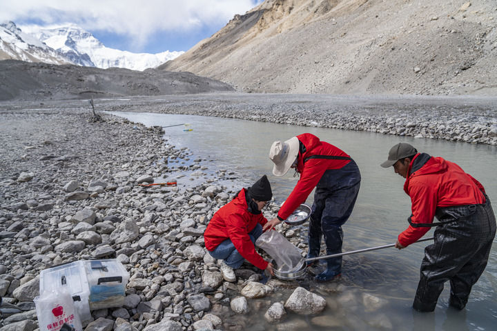 在珠峰腳下的絨布河畔,科考人員在采集水生生物樣本(5月22日攝)。新華社記者 孫非 攝