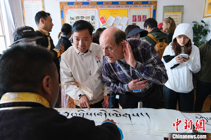 圖為5月18日上午,參訪團成員柯馬凱(Michael Crook)側(cè)耳傾聽藏文書法老師的講解。中新社記者 江飛波 攝