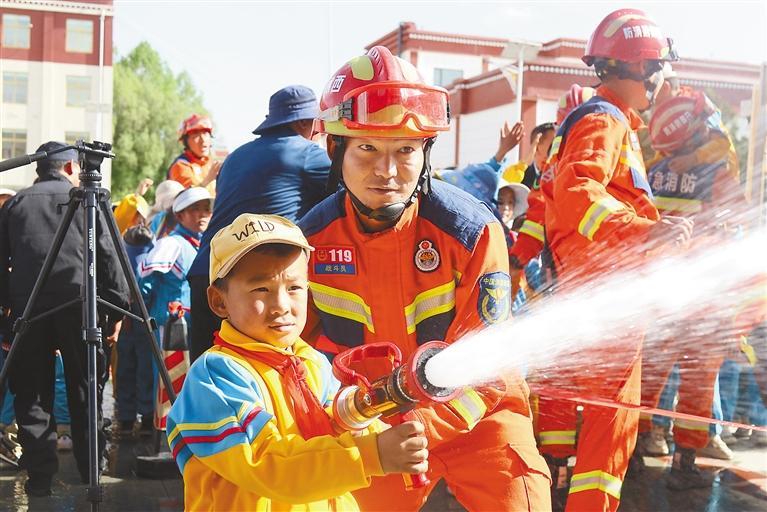 日喀則市小學學生體驗滅火救援器材。肖暄 攝