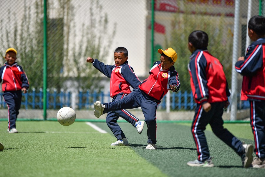 6月5日,扎西宗鄉(xiāng)完全小學(xué)的學(xué)生在人工草坪上踢足球。