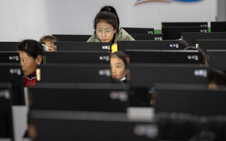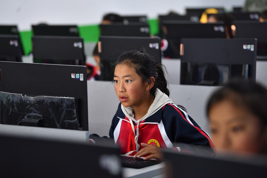 扎西宗鄉(xiāng)完全小學(xué)的學(xué)生在上計(jì)算機(jī)課(6月5日攝)。