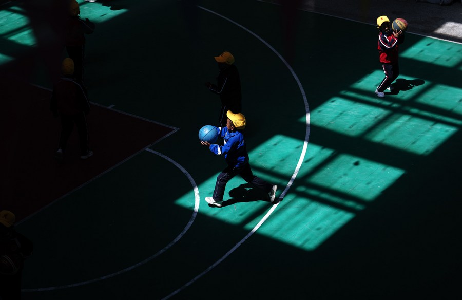 6月5日,扎西宗鄉(xiāng)完全小學(xué)學(xué)生在籃球課上投籃。