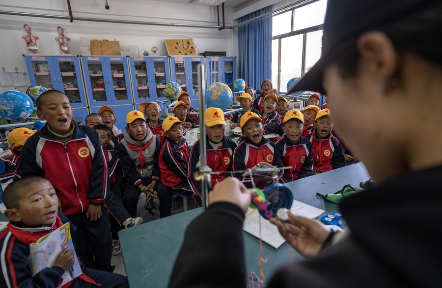 6月5日,扎西宗鄉(xiāng)完全小學(xué)的副校長(zhǎng)旦巴仁青在給學(xué)生上科學(xué)課。
