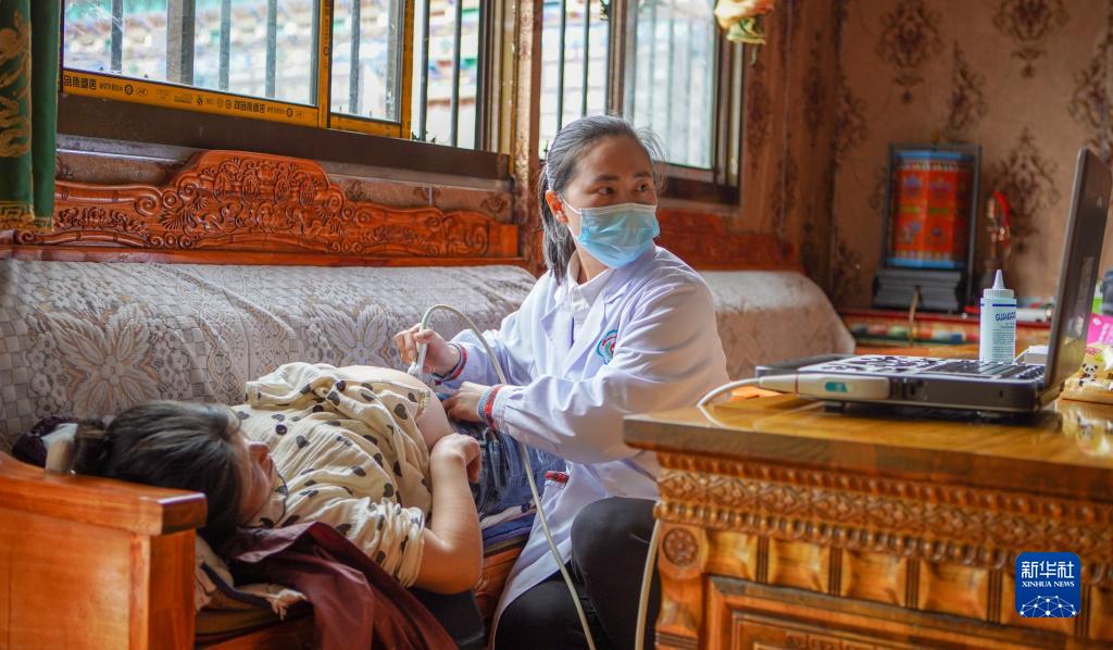 6月12日,王振疆(右)為吞不絨村89歲的村民娘姑進(jìn)行檢查。新華社記者 費(fèi)茂華 攝