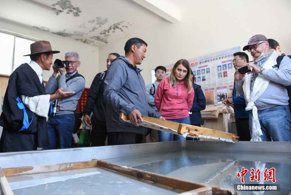 6月15日,西藏拉薩,記者們?cè)谀崮究h非遺工坊(藏紙制作廠)采訪了解藏紙。在第五屆中國(guó)西藏旅游文化國(guó)際博覽會(huì)召開(kāi)之際,國(guó)務(wù)院新聞辦組織中外媒體記者赴西藏采訪,路透社、共同社、西班牙埃菲社、意大利安莎社、新加坡《聯(lián)合早報(bào)》和中央廣電總臺(tái)、中國(guó)日?qǐng)?bào)等15家媒體的20名記者參加。6月15日,采訪團(tuán)一行前往拉薩市尼木縣參訪體驗(yàn)西藏傳統(tǒng)藏香、藏紙文化。
