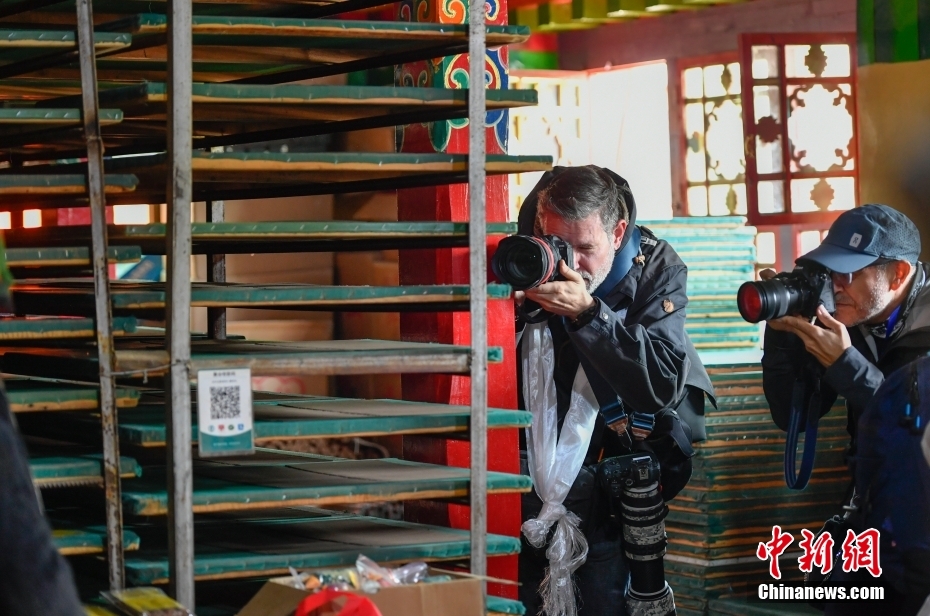 6月15日,西藏拉薩,記者們?cè)谀崮究h非遺工坊(藏紙制作廠)采訪拍攝。在第五屆中國(guó)西藏旅游文化國(guó)際博覽會(huì)召開(kāi)之際,國(guó)務(wù)院新聞辦組織中外媒體記者赴西藏采訪,路透社、共同社、西班牙埃菲社、意大利安莎社、新加坡《聯(lián)合早報(bào)》和中央廣電總臺(tái)、中國(guó)日?qǐng)?bào)等15家媒體的20名記者參加。6月15日,采訪團(tuán)一行前往拉薩市尼木縣參訪體驗(yàn)西藏傳統(tǒng)藏香、藏紙文化。