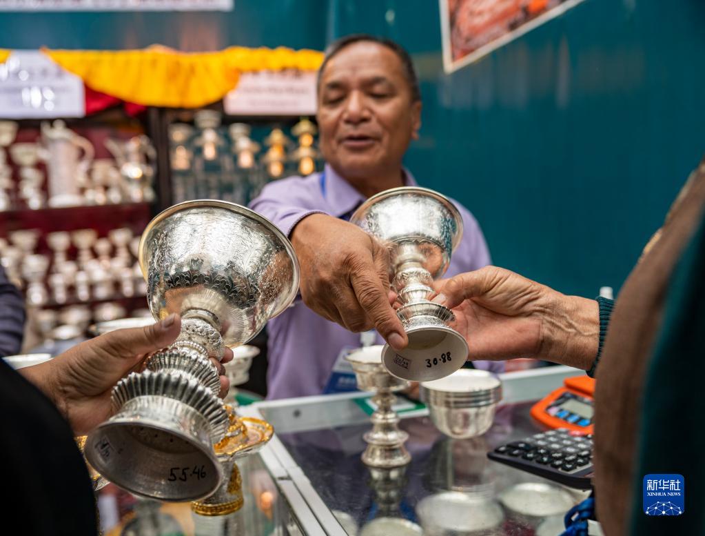 在第五屆藏博會現(xiàn)場,來自尼泊爾的參展商向顧客介紹自己的產(chǎn)品(6月18日攝)。新華社記者 孫非 攝