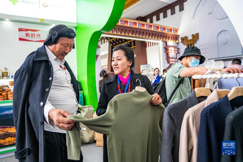 6月17日,工作人員在第五屆藏博會現(xiàn)場向顧客介紹產(chǎn)自阿里地區(qū)的羊絨衫產(chǎn)品。新華社記者 孫非 攝