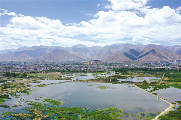 在別致的風(fēng)光中,拉魯濕地格外耀眼,呈東西帶狀的水域和蘆葦?shù)刂車弧拌偂鄙狭艘蝗G邊,與旁邊喧囂的市區(qū)形成了鮮明的對比,令人心曠神怡。