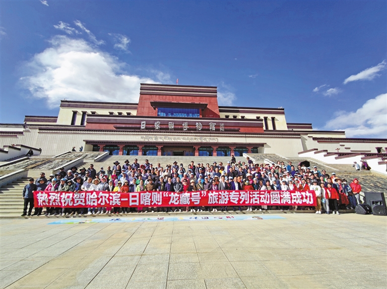 圖為從黑龍江省哈爾濱市乘坐2023年首趟“龍藏號”旅游專列的數(shù)百名游客順利抵達日喀則,并在日喀則博物館合影留念(6月2日攝)。記者 汪純 攝