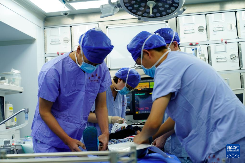 醫(yī)護人員在移動介入治療手術車上為先心病患兒進行微創(chuàng)手術。新華社記者 劉洪明 攝
