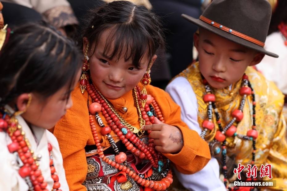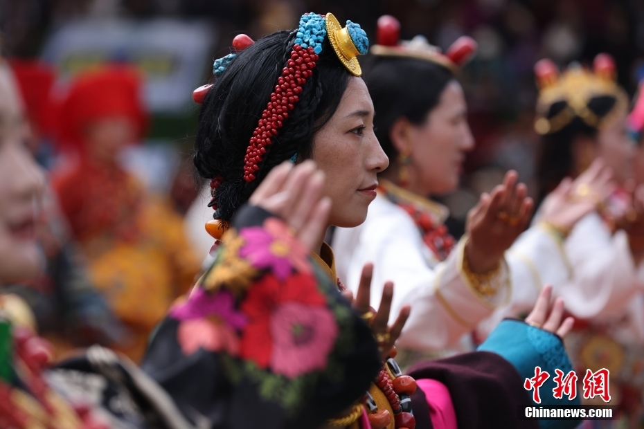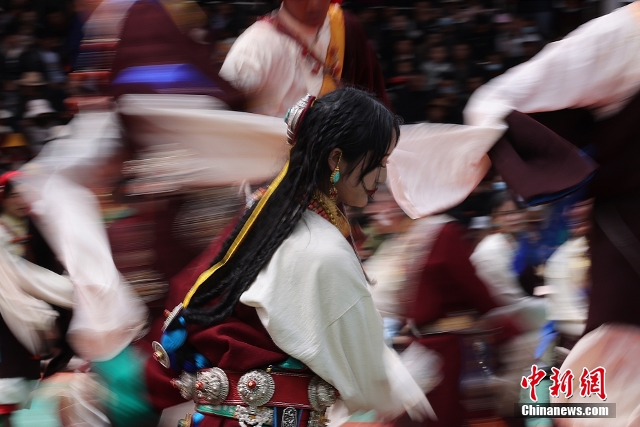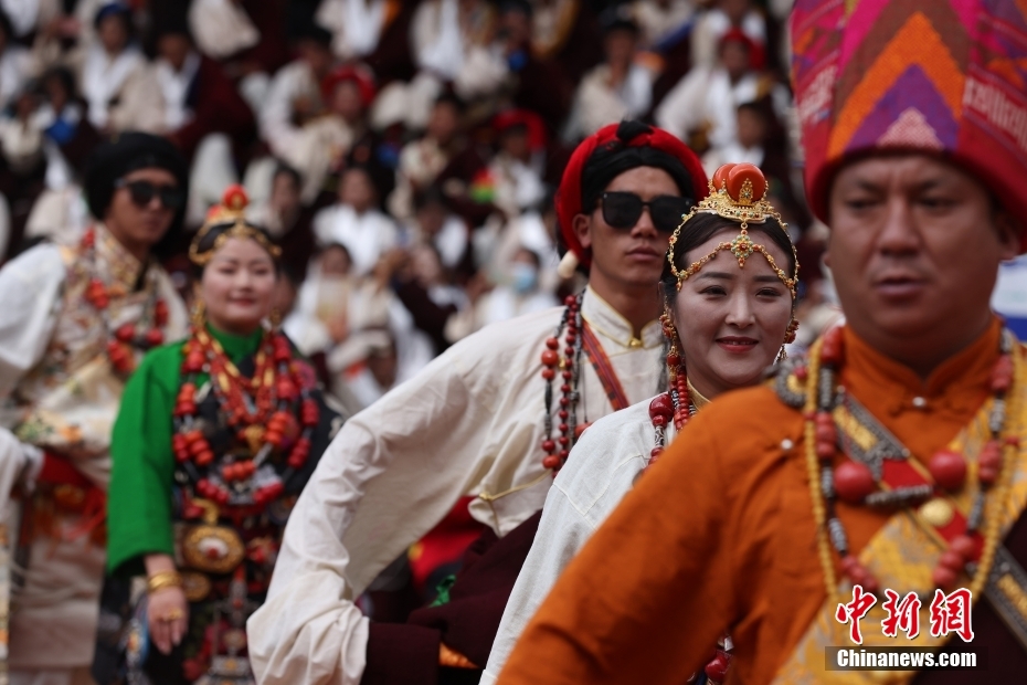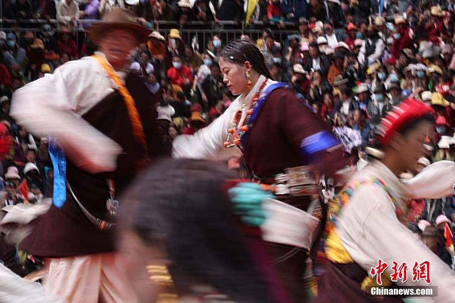 7月17日,西藏自治區(qū)昌都市貢覺縣,民眾身著極具特色的民族服裝服飾,載歌載舞出席當(dāng)?shù)氐奶厣椪够顒印?/p>