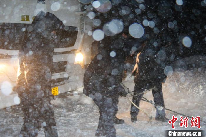 2022年2月27日,馬攸橋邊境檢查站民警在在海拔5200多米的馬木拉達坂救援被困人員和車輛。馬攸橋邊境檢查站 供圖