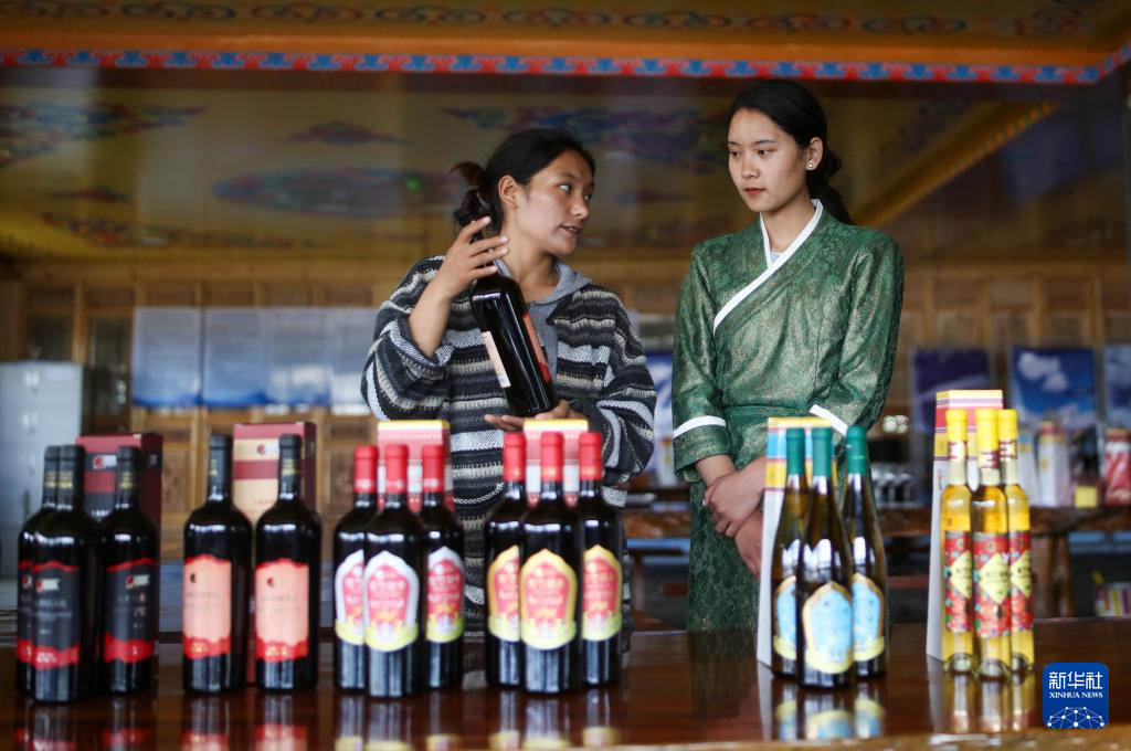 7月26日,桑日縣一家葡萄酒企業(yè)的員工曲珍(左)在跟同事一起練習(xí)企業(yè)葡萄酒產(chǎn)品介紹。新華社記者 旦增尼瑪曲珠 攝