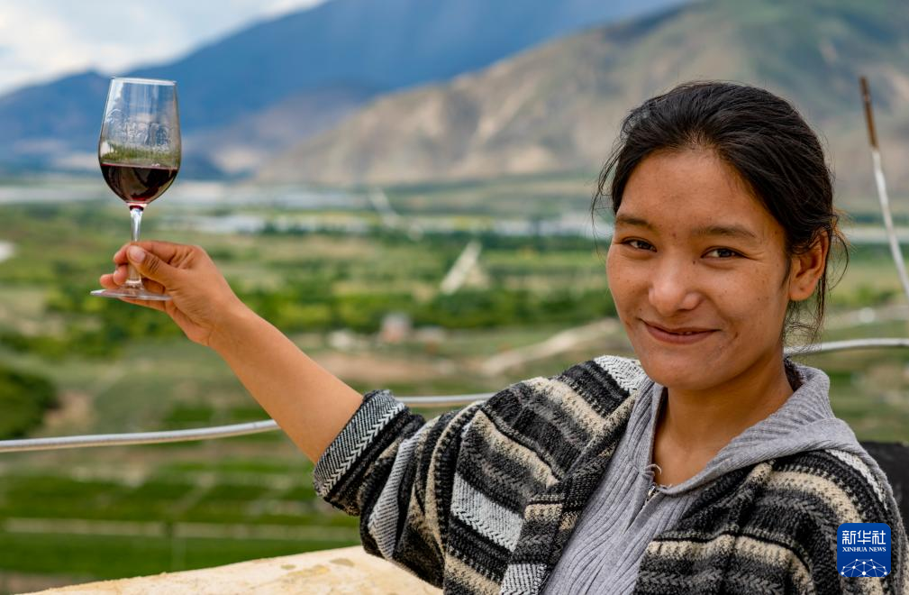7月26日,桑日縣一家葡萄酒企業(yè)的員工曲珍在展示公司生產(chǎn)的葡萄酒。新華社記者 姜帆 攝