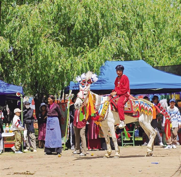 賽場(chǎng)上,幾個(gè)稚嫩的小伙子引起了大家的注意。他們熟練地跳上馬背、抓緊韁繩、目光堅(jiān)定?!巴郏√袅?!”“媽媽,那個(gè)哥哥拿到了哈達(dá)!”……只見(jiàn)16歲的單增阿旺策馬奔騰,俯身拾起地上的綠色哈達(dá),獲得大家的陣陣掌聲。“我從小就很喜歡騎馬,除了去年因?yàn)閷W(xué)業(yè)緊張,沒(méi)能參加賽馬表演,往常每年都會(huì)參加?!眴卧霭⑼f(shuō)。