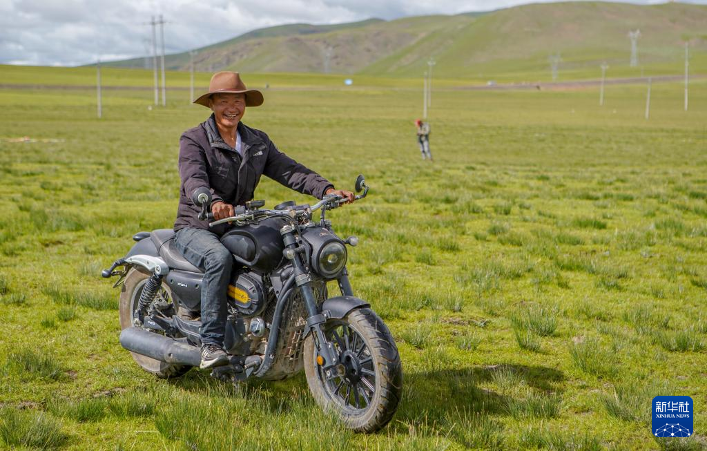 8月11日,次扎達在羌塘草原上騎摩托車出行。新華社記者 邵澤東 攝?
