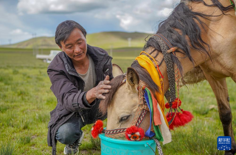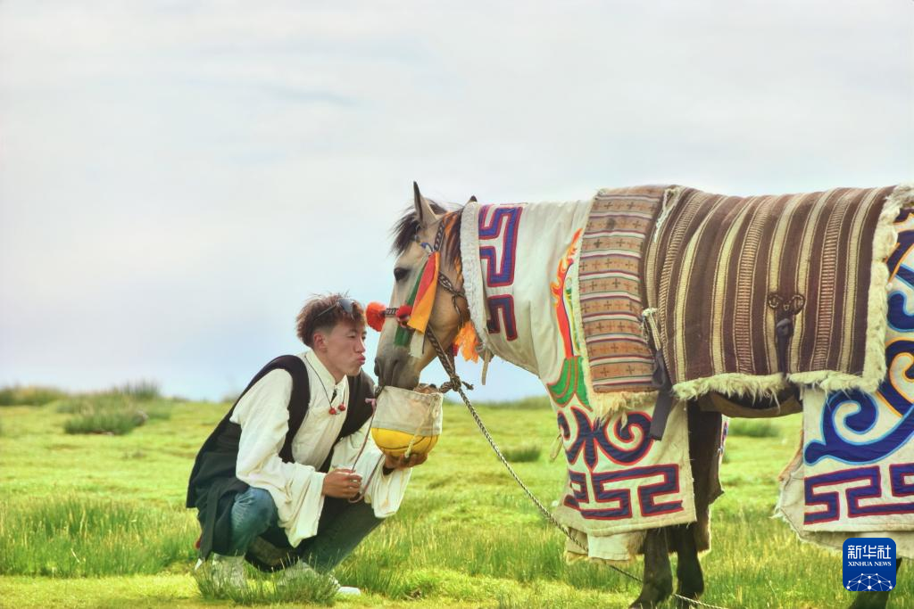 次扎達在給馬兒“隆達熱巴”喂食(8月9日攝)。新華社記者 陳澤鵬 攝