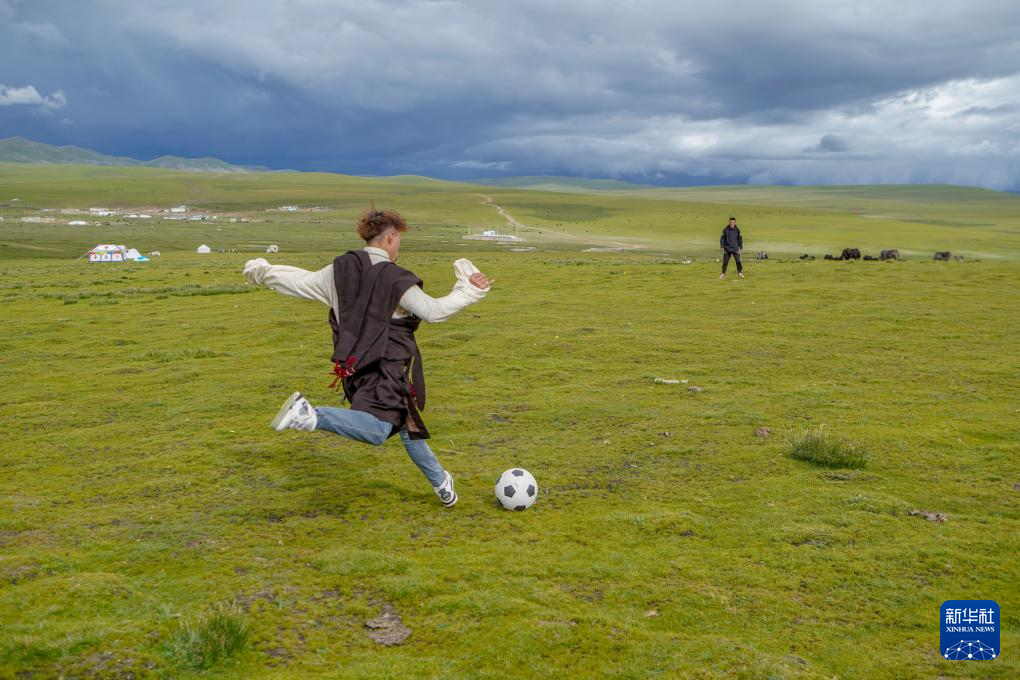 8月11日,旦增旺久和朋友在草原上踢足球。旦增旺久是次扎達兒子列熱覺旦的表哥,遠在千里之外的湖南上學,但還會經(jīng)常想起“隆達熱巴”。正值暑假,回到草原的他會細心地為“隆達熱巴”梳毛,跟它說悄悄話。新華社記者 邵澤東 攝