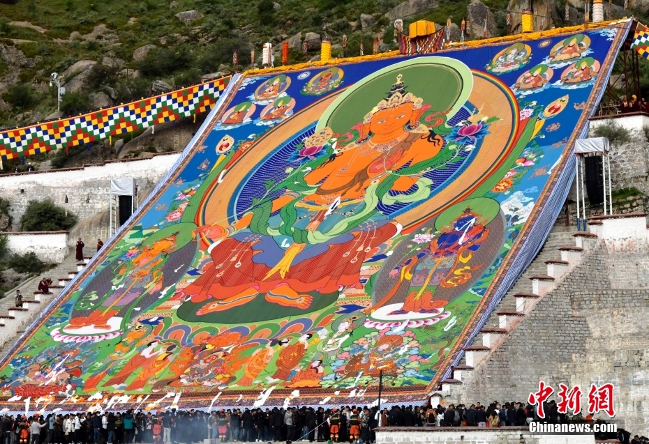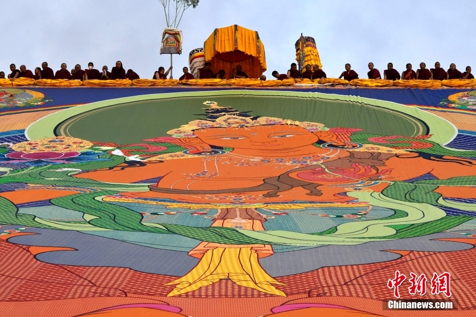 8月16日,巨幅強巴佛唐卡徐徐展開。