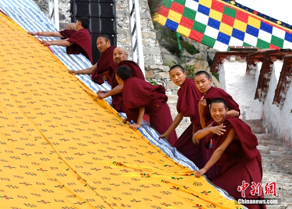 8月16日,哲蚌寺僧人們在展佛臺調(diào)整即將展出的巨幅唐卡。